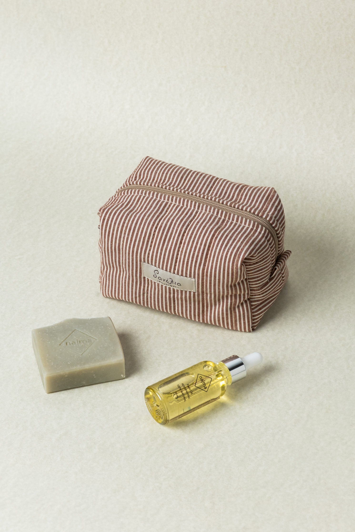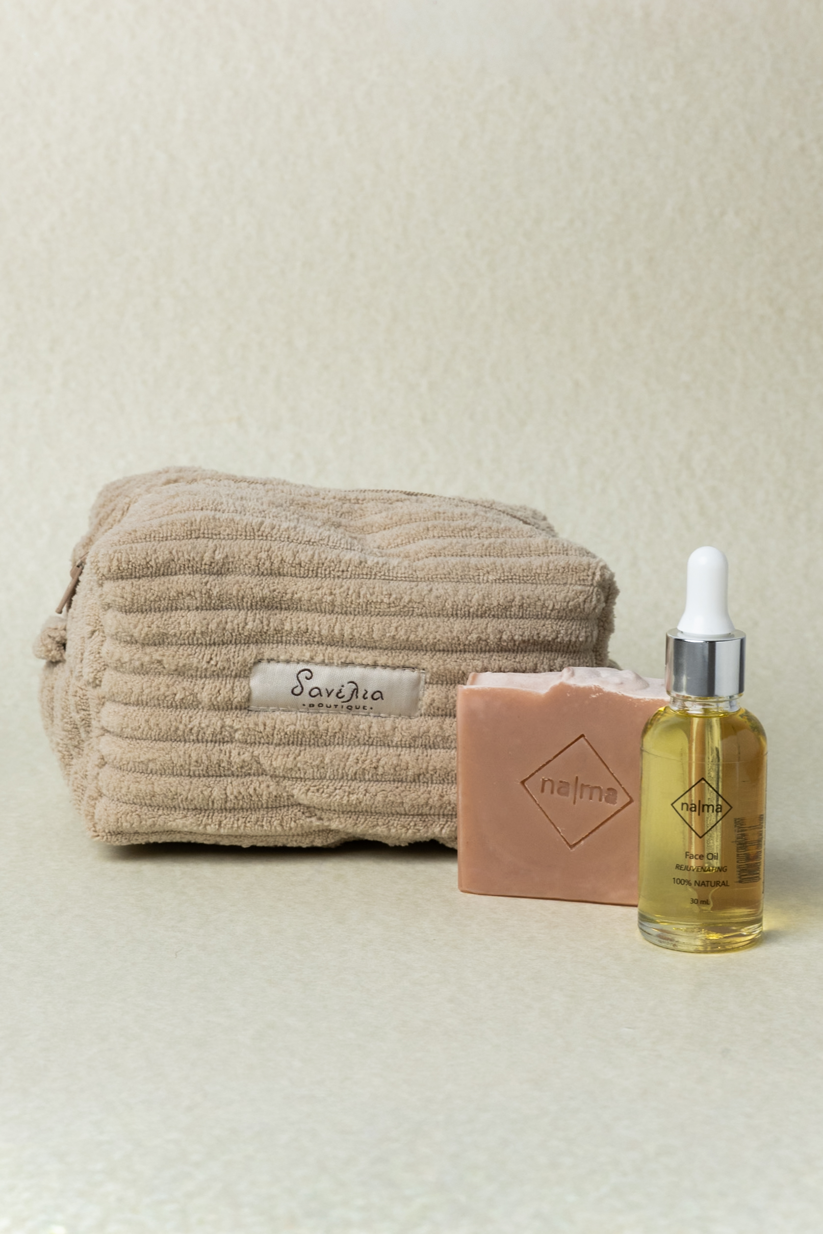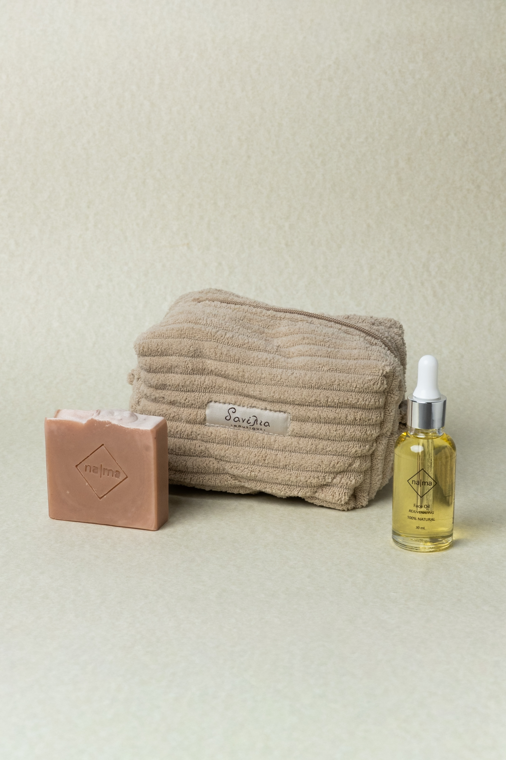 Δημιούργησε τη δική σου καθημερινή ρουτίνα καθαρισμού και ενυδάτωσης με αυτό το πρακτικό σετ περιποίησης προσώπου σε νεσεσέρ. Συνδύασε ένα φυσικό σαπούνι προσώπου με ένα θρεπτικό έλαιο, επιλέγοντας ανάλογα με τις ανάγκες του δέρματός σου. Όλα τα απαραίτητα σε ένα χειροποίητο, κομψό και λειτουργικό νεσεσέρ, έτοιμο για καθημερινή χρήση, για ταξίδια ή ως όμορφο δώρο.